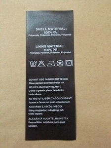 水洗标又称洗涤标、洗水标、洗唛、洗水唛等等,是服装、家用纺织品等不可或缺生产辅料,主要用于标注成份、水洗要求、生产厂家、产地等信息。 常见的可打印水洗标的材质有带涂层的尼龙洗标、丝带(缎带)洗标、无纺布洗标、聚酯带洗标等,不同材质的洗标对打印机有不同的要求。